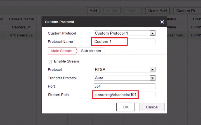 2.3. Pilih Custom Protocol 1, ketik Protokol Name dan Stream Path dari Main Stream : streaming/channels/101