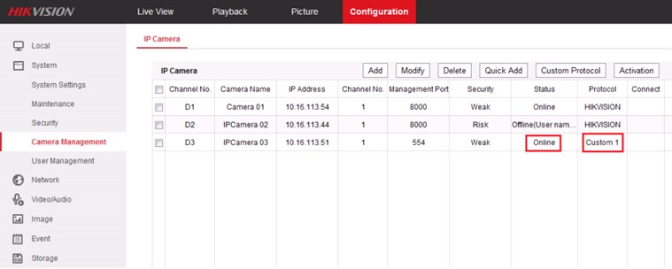 Catatan : Port manajemen Custom Protokol adalah port 554. Protokol Hikvision adalah port 8000 dan protokol Onvif adalah port 80