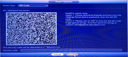 10. Masukkan Security Code yang dikirim di email tadi di menu reset password DVR/NVR, Klik Next.