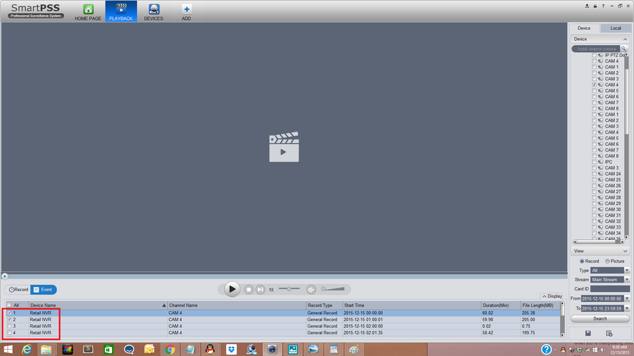 8. Select or Check which footage you need to export or download. Video footage can be viewed by clicking on the "Play" button and by selected events.