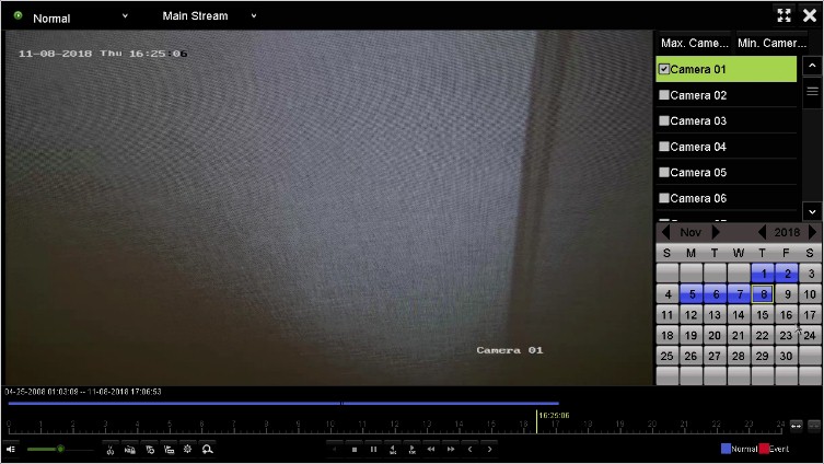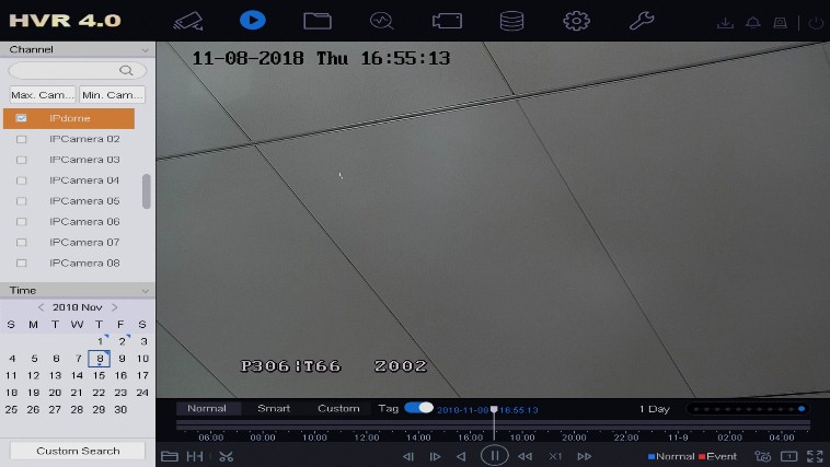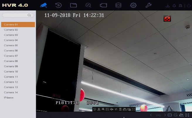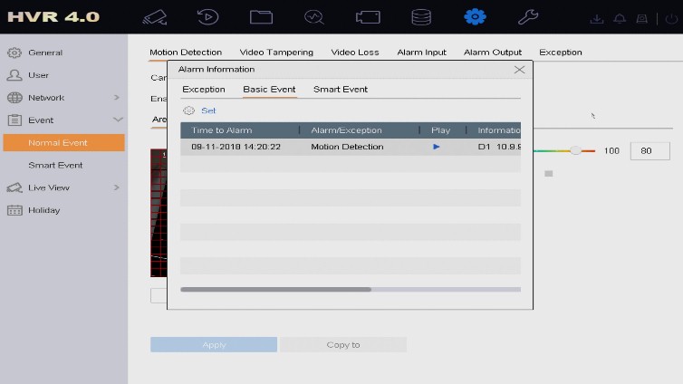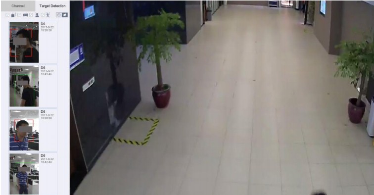 Interpretasi: Antarmuka GUI 4.0 memiliki fungsi baru. Setelah fungsi Event diaktifkan (misalnya smart detection(VCA);vehicle detection;face detection;human body detection), kalau memilih target yang sesuai dalam Target Detection di antarmuka Live View, ketika alarmnya ditrigger, gambar yang sesuai akan muncul di daftar kiri. Klik gambar dapat playback video Event yang sesuai.