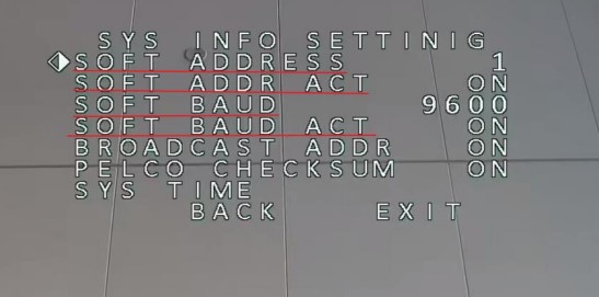 Setting Address dan Baud rate pada speed dome, kita juga harus mengaktifkannya SOFT ADDR ACT dan SOFT BAUD ACT. Alamat lunak adalah alamat yang valid untuk menghubungkan speed dome ketika SOFT ADDR ACT di ON, alamat lunak yang dapat dipilih dari 0/1(Pelco-D/P) hingga 255. Soft baud rate adalah baud rate yang valid untuk speed dome saat SOFT BAUD ACT di ON kan, dengan 2400, 4800, 9600 dan 19200 dapat dipilih.