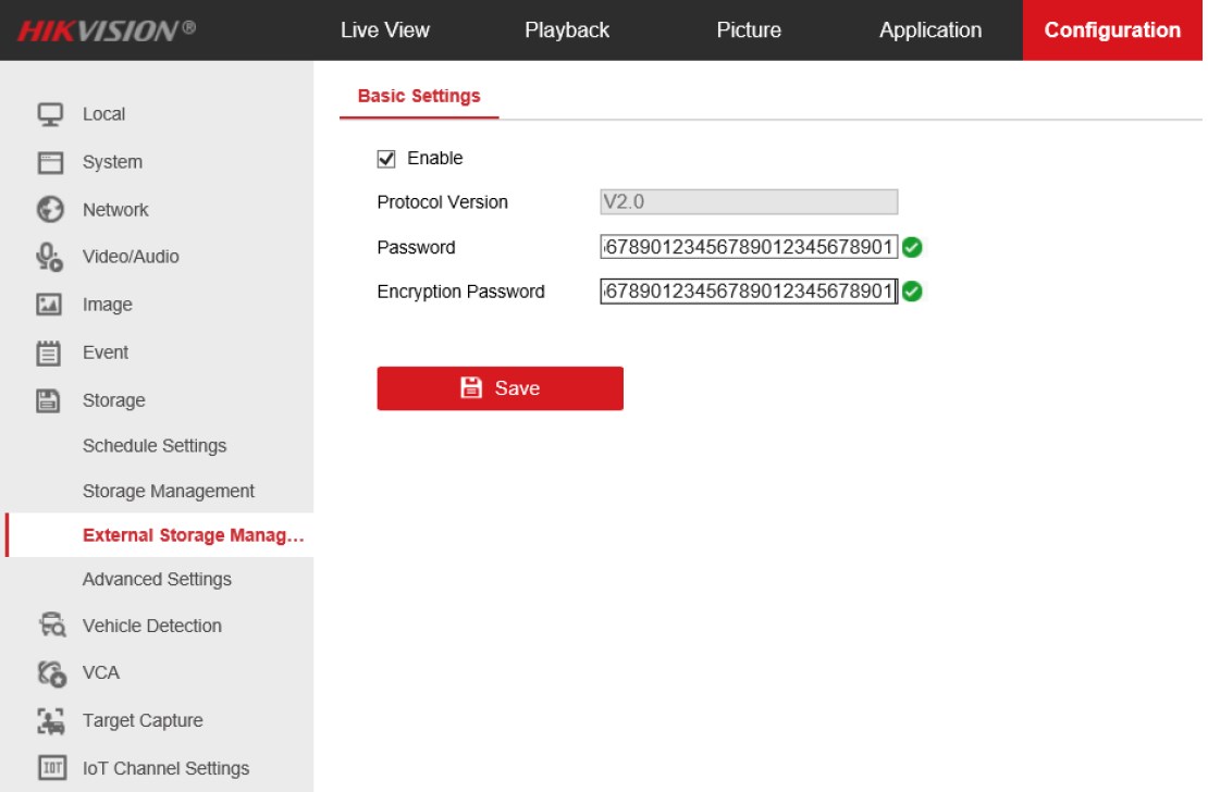 b. Masuk ke halaman web NVR, buka Configuration – Storage – External Storage Management, klik Enable, lalu atur Kata Sandi dan Kata Sandi Enkripsi.