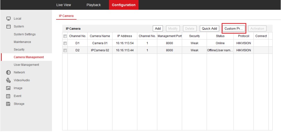 2.2. Masuk ke halaman web NVR, dan buka Konfigurasi – System – Camera Manajemen – IP Camera, klik Custom Protokol