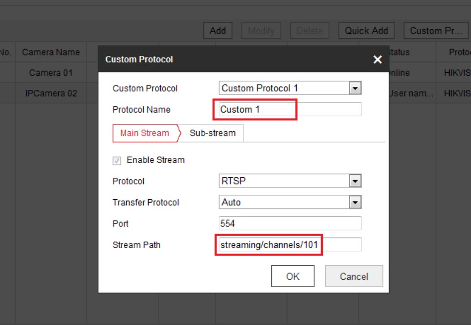 2.3. Pilih Custom Protocol 1, ketik Protokol Name dan Stream Path dari Main Stream : streaming/channels/101
