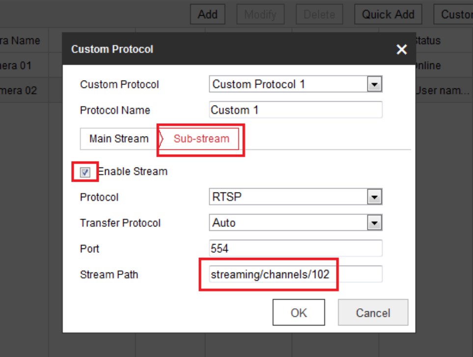 2.4. Klik Sub Stream and Enable Stream, lalu ketik Stream Path dari Sub stream: streaming/channels/102