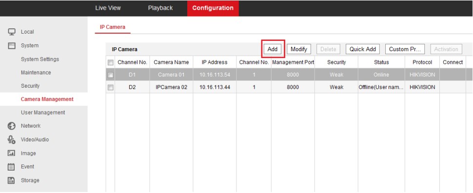 3.1. Buka Configuration – System - Camera Management – IP Camera, dan klik Add
