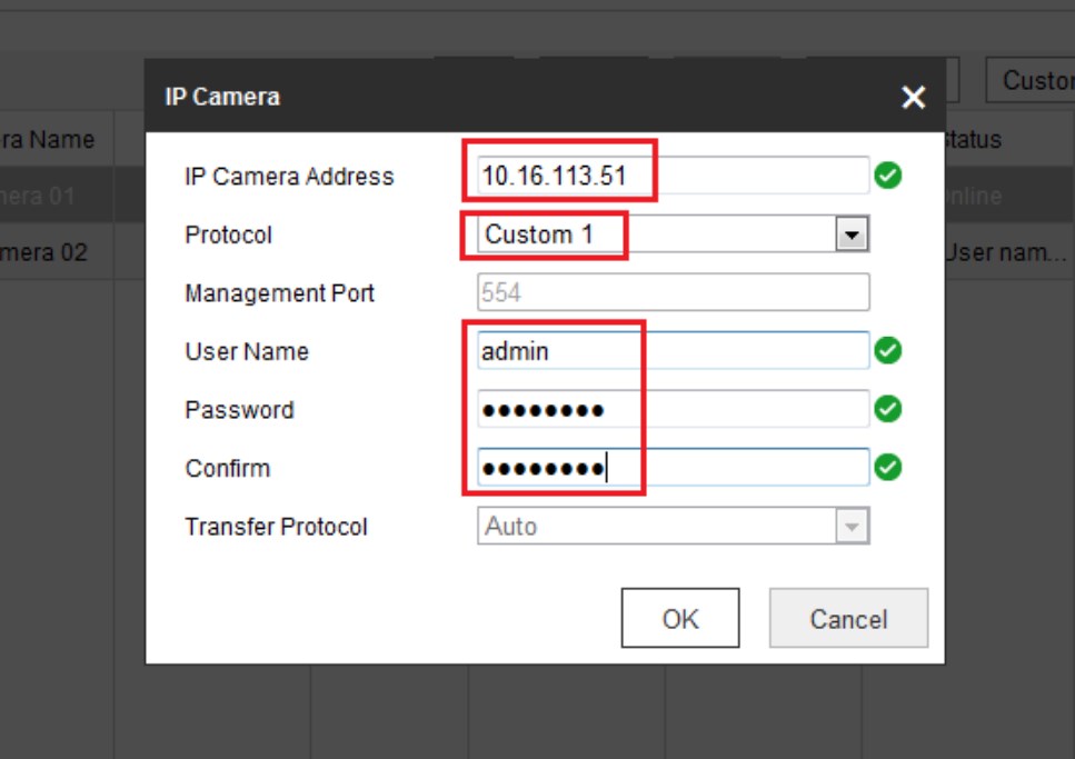 3.2. Ketik Alamat IP Camera, dan pilih Custom 1 Protokol yang telah dibuat sebelumnya. Kemudian isi User Name dan Password, klik OK