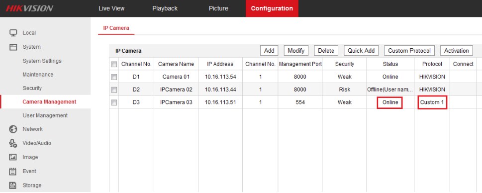 Note : Port manajemen Custom Protokol adalah port 554. Protokol Hikvision adalah port 8000 dan protokol Onvif adalah port 80