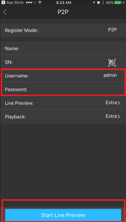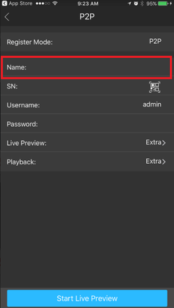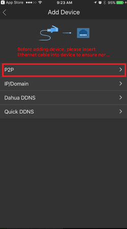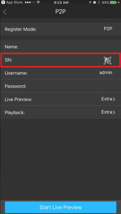 Dengan perangkat mobile Anda di tangan, pergi ke perekam lokal Anda, arahkan ke pengaturan P2P dan memindai kode QR ke sisi kanan. Anda juga akan melihat SN (Serial Number) dari perekam di bawah kode QR, Anda dapat menggunakannya untuk mengetik secara manual di SN ke dalam bidang SN dari aplikasi seluler Infinity Black SE. Catatan: Anda harus memiliki P2P "diaktifkan" dari perekam lokal dengan status yang menunjukkan "online" atau "menghubungkan kesuksesan".