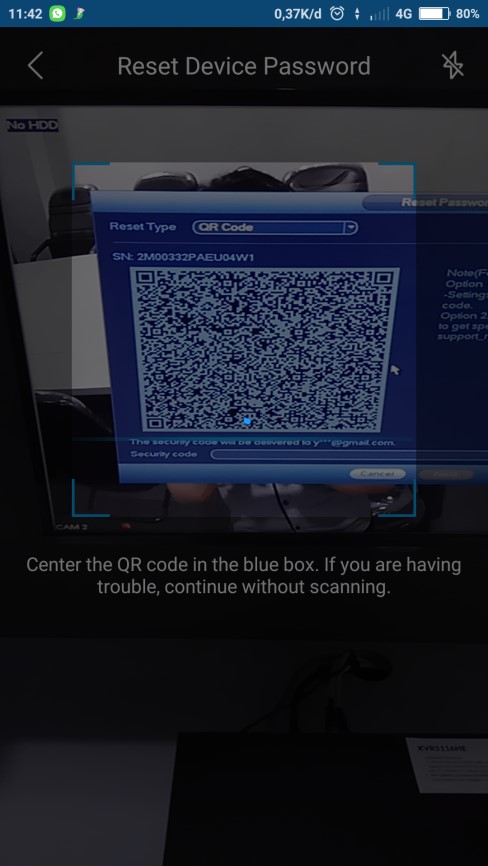8. Setelah masuk ke menu reset device password, scan Barcode yang ada di layar monitor.